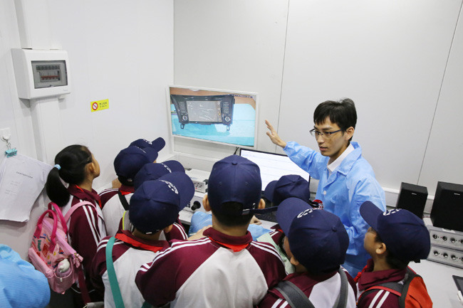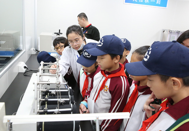 隨后,小記者團來到計量校準、電磁兼容檢測、化學分析、可靠性與環境試驗等實驗室,觀看了紡織品檢測、車載導航抗輻射電磁干擾試驗、汽車座椅測試等過程演示。面對陌生的儀器設備,孩子們化身“好奇寶寶”,紛紛舉手與技術人員交流互動。