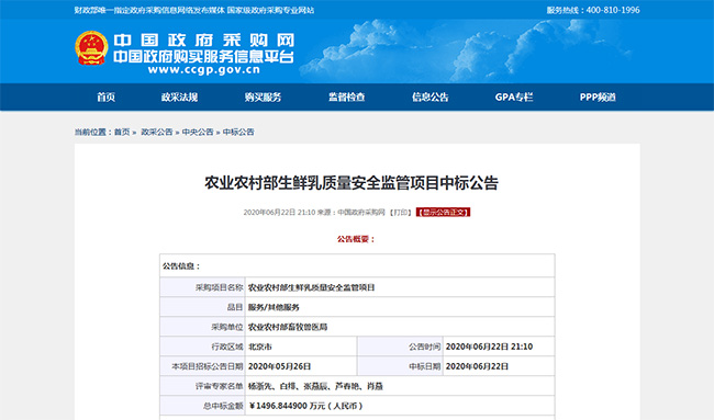 (1)農(nóng)業(yè)農(nóng)村部生鮮乳質(zhì)量安全監(jiān)管項(xiàng)目