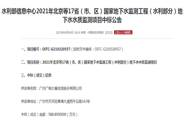 今年6月,國家水利部對2021年北京等17?。ㄊ?、區(qū))國家地下水監(jiān)測工程(水利部分)地下水水質監(jiān)測項目進行公開招標,廣電計量從眾多權威檢測機構中脫穎而出成功中標。