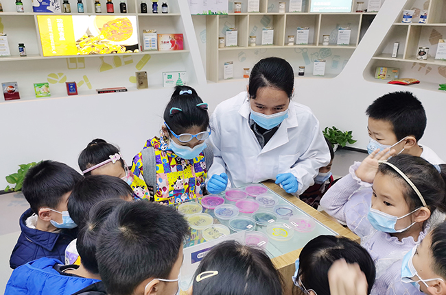 細(xì)菌長(zhǎng)什么樣?通過(guò)觀看顏色、外觀各異的細(xì)菌培養(yǎng)皿,技術(shù)人員向?qū)W生強(qiáng)調(diào)要養(yǎng)成講衛(wèi)生的好習(xí)慣。