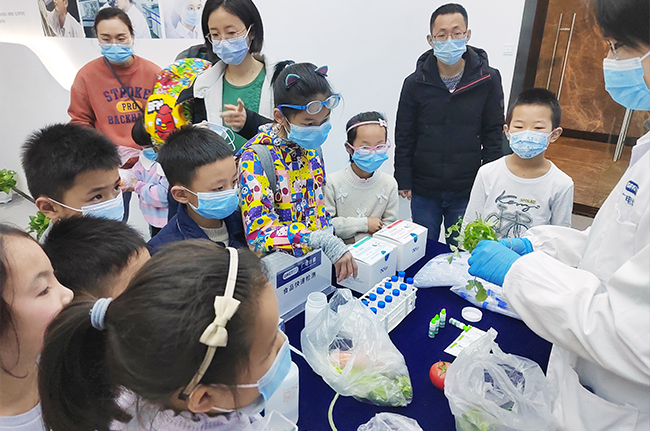 最后,小朋友們拿著提前從家里準(zhǔn)備的蔬菜,交給技術(shù)人員進(jìn)行快檢,確認(rèn)蔬菜上的農(nóng)藥殘留是否達(dá)標(biāo)。