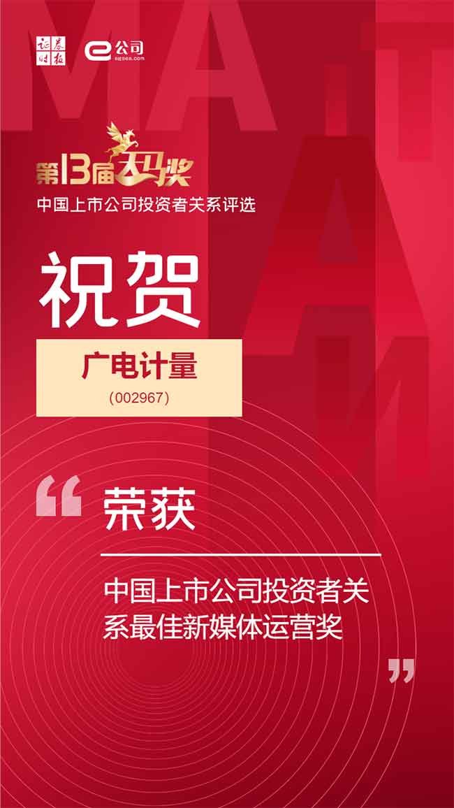 4月22日,由證券時報社主辦、e公司承辦的“穩(wěn)中求進、篤定前行”第十三屆中國上市公司投資者關(guān)系“天馬獎”榜單正式揭曉。廣電計量(002967.SZ)憑借在投資者關(guān)系管理及新媒體運營方面的良好表現(xiàn),榮獲“中國上市公司投資者關(guān)系最佳新媒體運營獎”,充分體現(xiàn)了監(jiān)管部門和資本市場對公司信息披露、投資者關(guān)系管理工作的認可。
