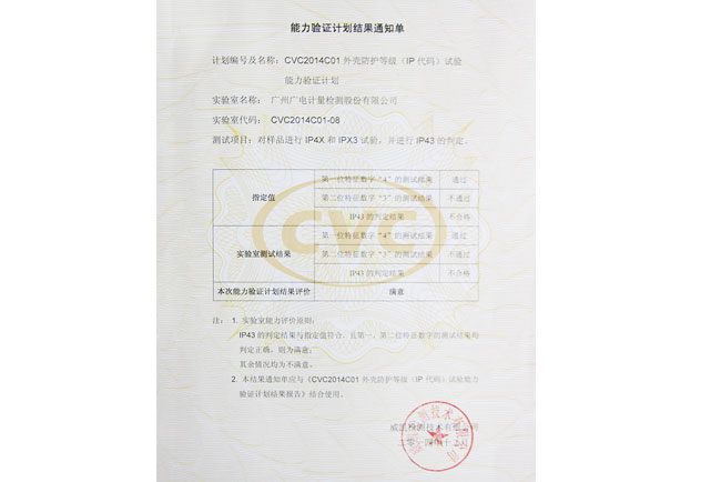 GRGT近期收到威凱檢測技術(shù)有限公司關(guān)于“CVC2014C01 外殼防護(hù)等級(IP代碼)試驗(yàn)”能力驗(yàn)證計(jì)劃結(jié)果通知單,結(jié)果顯示GRGT環(huán)境試驗(yàn)與可靠性檢測中心以優(yōu)異成績通過本次能力驗(yàn)證。