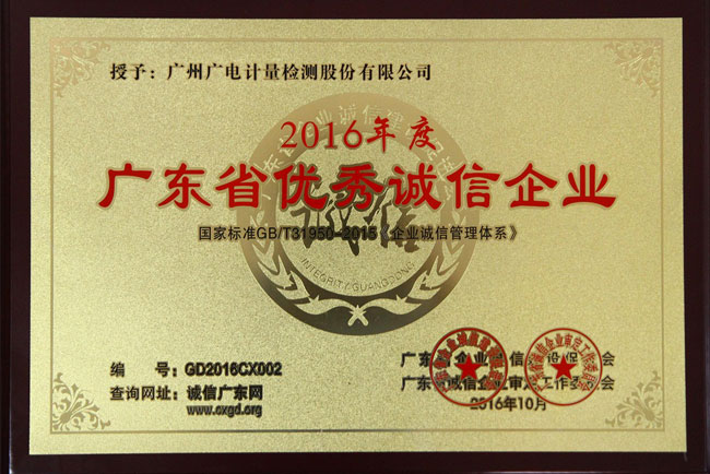 2016廣東省誠信企業活動日于10月27日上午在廣州舉行,廣電計量榮獲“2016年度廣東省優秀誠信企業”稱號。