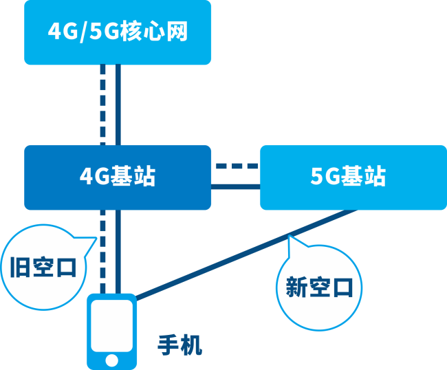 藍工:NR是New Radio的縮寫,也被稱為“新空口”。我們都知道,5G是非常靈活的,具體怎么靈活呢?它可以獨立組網(wǎng),也可以跟4G一起非獨立組網(wǎng)。以手機為例,同一部手機因此擁有兩路空口連接,跟4G基站之間的鏈路就是“舊空口”,跟5G基站之間的鏈路就是 “新空口”了。