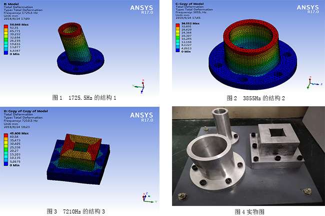 通過仔細分析帶電探傷儀工作原理可知,帶電探傷儀能通過激勵探頭和接收探頭共同作用,采用“一發(fā)一收”工作模式,獲取待測試結構的一階固有頻率,通過一階頻率值判斷絕緣子是否發(fā)生了損傷。廣電計量瓷支柱絕緣子帶電探傷儀性能檢測系統(tǒng)根據帶電探傷儀的工作頻率范圍(100Hz~10000Hz),設計了三種一階頻率在此范圍的特殊結構裝置——一端固定,一端自由的懸臂梁結構,并用有限元軟件進行仿真,結果如下圖所示。(圖1~ 3為有限元仿真的三種結構的一階固有頻率,圖4為制作的實物圖)