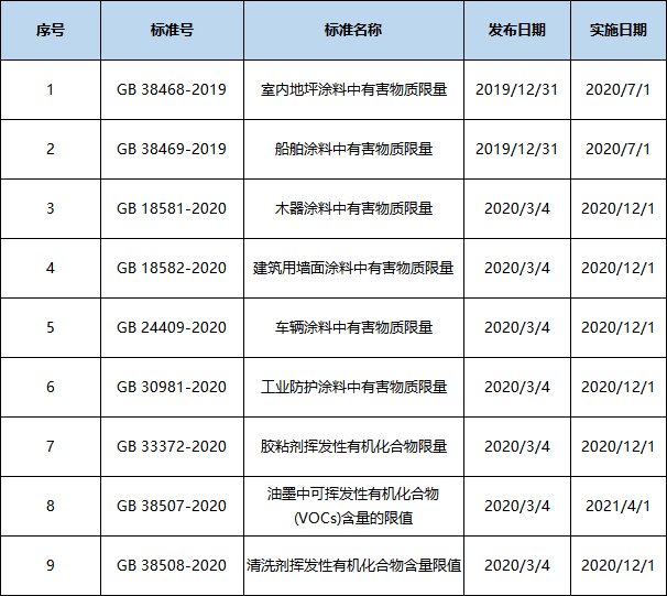 針對涂料、油墨、膠粘劑、清洗劑等四大類產品的相關VOCs含量限值標準均順利完成制定工作并發(fā)布。且已開始實施,屬于國家強制標準