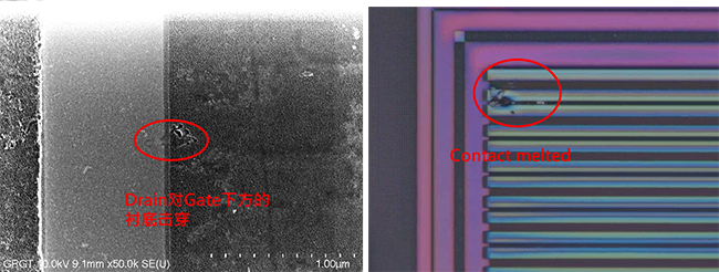 常見ESD物理失效表現(xiàn):襯底擊穿、多晶硅熔融、GOX pin hole、contact melted、metal melted等(見圖1),常見EOS物理失效表現(xiàn):氧化層、金屬層大面積熔融以及封裝體碳化等現(xiàn)象(見圖2)。