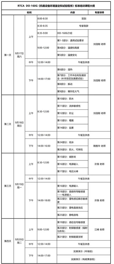 《機(jī)載設(shè)備環(huán)境條件和試驗(yàn)程序》全部試驗(yàn)原理及方法,包括通用實(shí)驗(yàn)要求:溫度、高度、溫度變化、濕熱、沖擊、振動、爆炸性大氣、防水、流體敏感性、砂塵、霉菌、鹽霧、結(jié)冰、防火、電源輸入、電壓尖峰、音頻傳到、感應(yīng)信號、射頻敏感度、射頻能量發(fā)射、雷電感應(yīng)、雷電直接效應(yīng)、磁影響、靜電放電共26部分。(涵蓋環(huán)境及電源特性,EMC二個測試技術(shù)領(lǐng)域),詳見課程大綱如下: