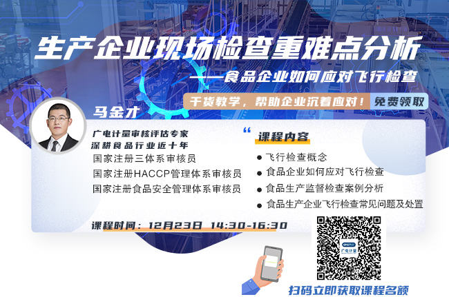 為助力質(zhì)量強國建設,提升食品行業(yè)現(xiàn)場管理水平,強化質(zhì)量管理要求,廣電計量特邀請國家食品生產(chǎn)管理體系審核員、HACCP審核員 馬金才老師給大家講授《生產(chǎn)企業(yè)現(xiàn)場檢查重難點分析——食品企業(yè)如何應對飛行檢查》公開課課程,詳細講解食品生產(chǎn)企業(yè)生產(chǎn)監(jiān)督檢查依據(jù)、監(jiān)督檢查要點、飛行檢查常見問題及整改措施,協(xié)助相關企業(yè)優(yōu)化管理,提高管理水平,降低質(zhì)量風險。
