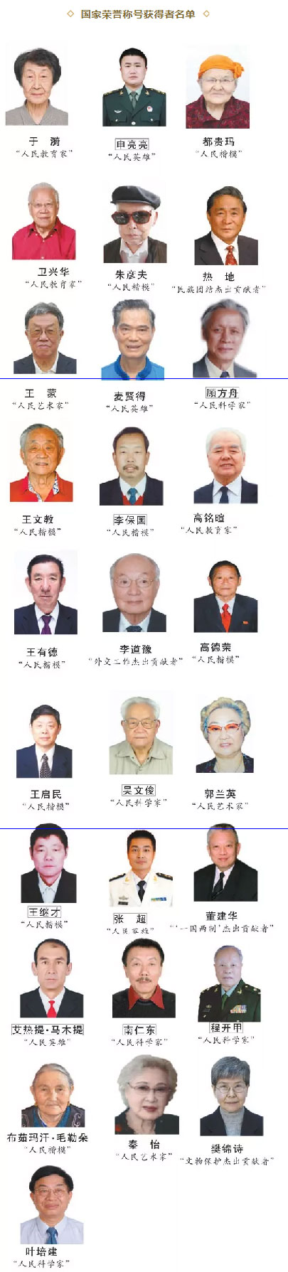 授予葉培建、吳文俊、南仁東(滿族)、顧方舟、程開甲“人民科學家”國家榮譽稱號;授予于漪(女)、衛興華、高銘暄“人民教育家”國家榮譽稱號;授予王蒙、秦怡(女)、郭蘭英(女)“人民藝術家”國家榮譽稱號;授予艾熱提·馬木提(維吾爾族)、申亮亮、麥賢得、張超“人民英雄”國家榮譽稱號;授予王文教、王有德(回族)、王啟民、王繼才、布茹瑪汗·毛勒朵(女,柯爾克孜族)、朱彥夫、李保國、都貴瑪(女,蒙古族)、高德榮(獨龍族)“人民楷模”國家榮譽稱號;授予熱地(藏族)“民族團結杰出貢獻者”國家榮譽稱號;授予董建華“‘一國兩制’杰出貢獻者”國家榮譽稱號;授予李道豫“外交工作杰出貢獻者”國家榮譽稱號;授予樊錦詩(女)“文物保護杰出貢獻者”國家榮譽稱號。