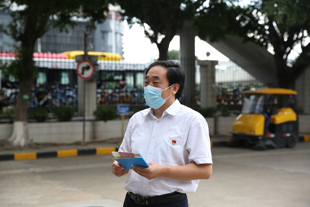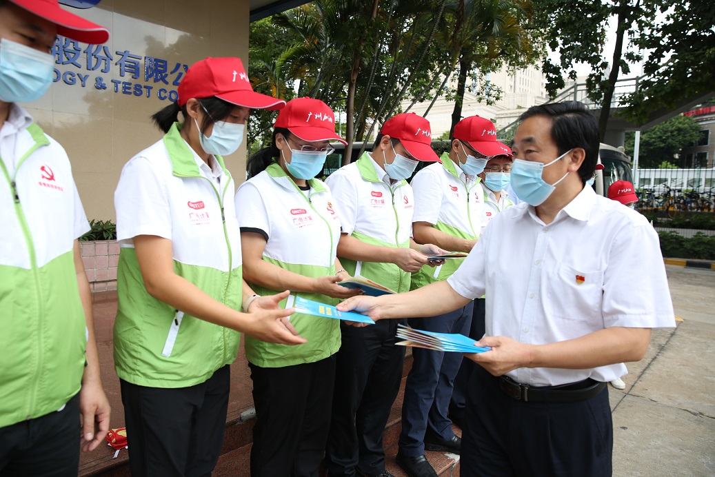 (照片組圖:6月10日,廣電計(jì)量黨委書記、總經(jīng)理黃敦鵬,黨委副書記白云對(duì)黨員突擊隊(duì)志愿者進(jìn)行動(dòng)員講話,鼓勵(lì)志愿者努力為廣州疫情防控工作做出更大貢獻(xiàn),并叮囑大家做好自身防護(hù)。志愿者們扛著黨旗,以飽滿的熱情投入支援荔灣全員核酸檢測(cè)的工作中。)
