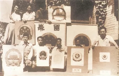 清華大學(xué)營(yíng)建系師生設(shè)計(jì)國(guó)徽?qǐng)D案時(shí)合影,真實(shí)地再現(xiàn)了當(dāng)年設(shè)計(jì)的十余種方案。